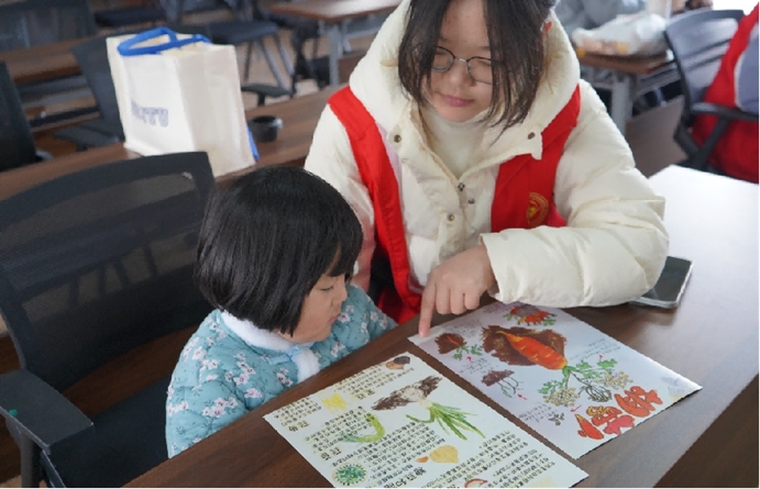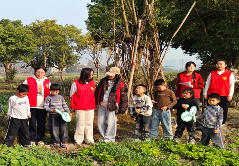 实践队充分发挥专业优势,让古老的农耕智慧成为可触摸的课堂,使脚下的土地变为鲜活的教材,为乡村文化振兴注入新动力。队员们以二十四节气为脉络,深入解读《齐民要术》等古籍中的农事记载,带领孩子们诵读节气歌和农谚,在韵律中体悟春生夏长、秋收冬藏的时序流转。在村干部的悉心指引下,孩子们走下田垄,亲手触摸油菜宽厚的叶片,俯身观察豌豆苗舒展的茎蔓,在具象场景中理解本地“冬水田与旱作轮作”模式所蕴含的生态智慧。这堂“行走的农耕课”,不仅传承了中华优秀传统农耕智慧,更引导孩子们建立起与土地的情感联结。