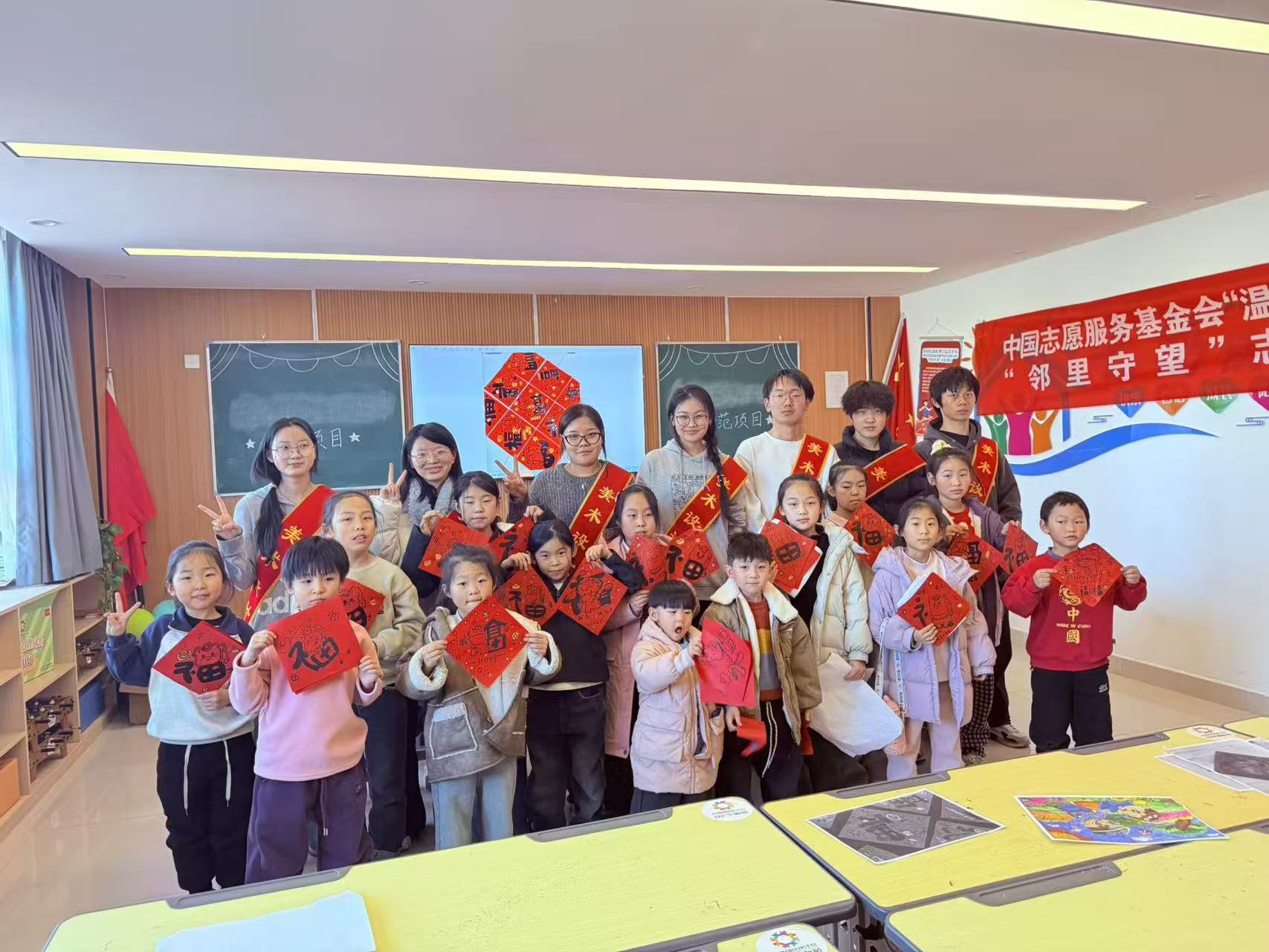 活动伊始,志愿者以“什么是福”“过年为什么贴福字”为趣味话题,通过互动问答快速拉近与孩子们的距离,引导大家分享自家贴福的传统习俗。随后,志愿者结合“福”字的字形演变与文化寓意,进行生动讲解,让孩子们在汉字拆解中感悟幸福的多重意蕴。绘画环节中,志愿者为孩子们详细讲解福字笔画的勾勒方法与色彩搭配技巧,并逐一耐心指导,鼓励他们自由创作。孩子们专注投入,有的勾勒出骏马形态,有的添加祥云、灯笼等吉祥图案,红色卡纸上渐渐呈现出一幅幅充满童趣的“福”字作品。活动尾声,孩子们手持作品相互展示、分享创作心得,脸上洋溢着自信与喜悦。