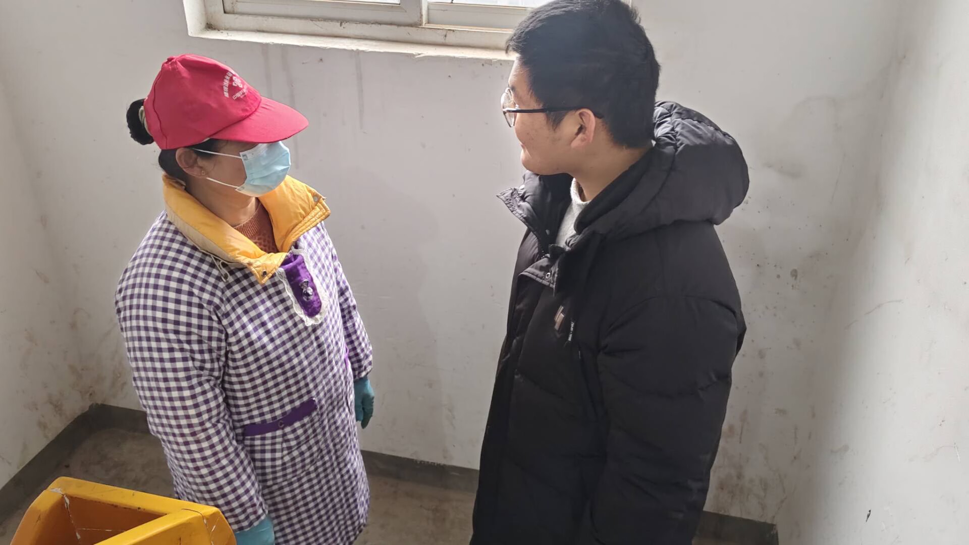 图为实践团成员和保洁工作人员交流日常工作,了解基层服务日常。邱栋 供图