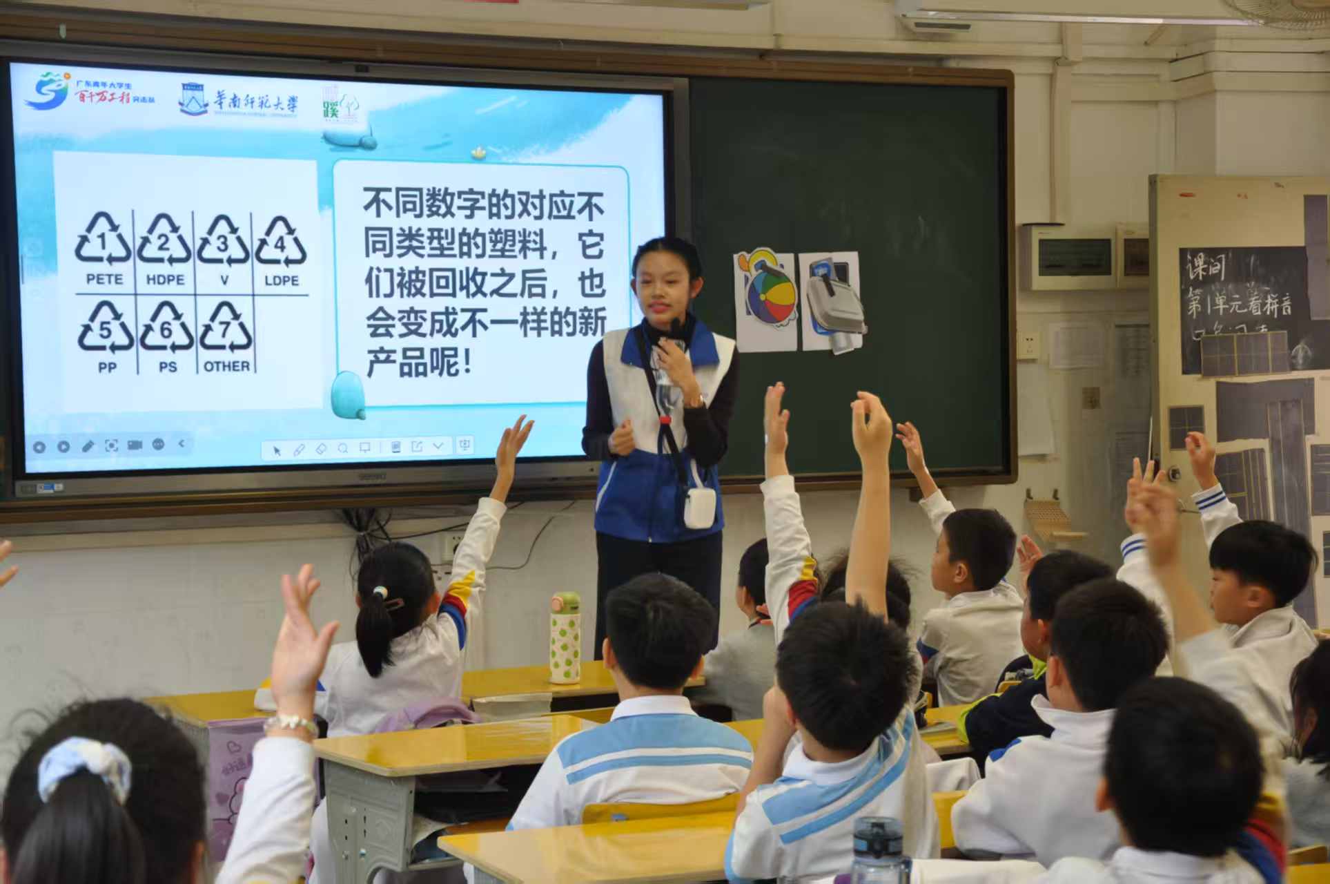 图为学生积极参与课堂环保知识问答