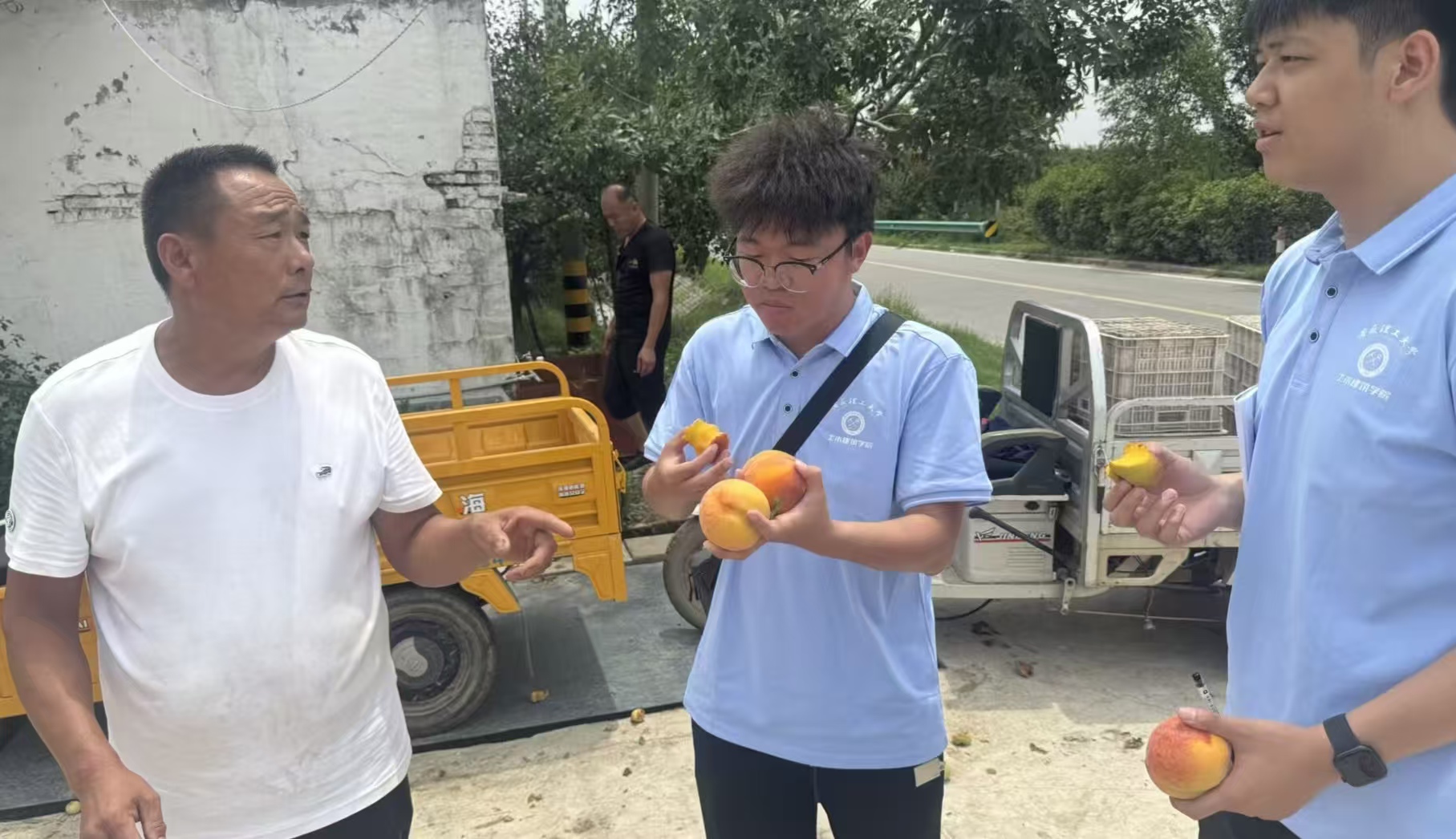 座谈会后,团队深入村民之中开展调研。恰逢黄桃丰收,田间地头堆满金黄的果实,农户们正忙着分拣、装箱。有农户提到,散户种植在品种改良、市场议价等方面仍有局限,期待更多合作社或企业带动。