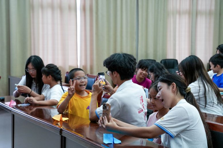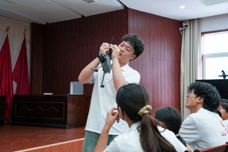 以纸飞机互动引导孩子进入科技主题,以逐一组装方式向孩子展示无人机设备。在青少年全程专注观摩的过程中,无人机完成升空、悬停、转向等基础演示,活动激发了青少年浓厚的科技兴趣,大家就设备安装调试流程、操控原理与实践技巧等踊跃提问,实践队成员均进行了细致专业的现场解答。