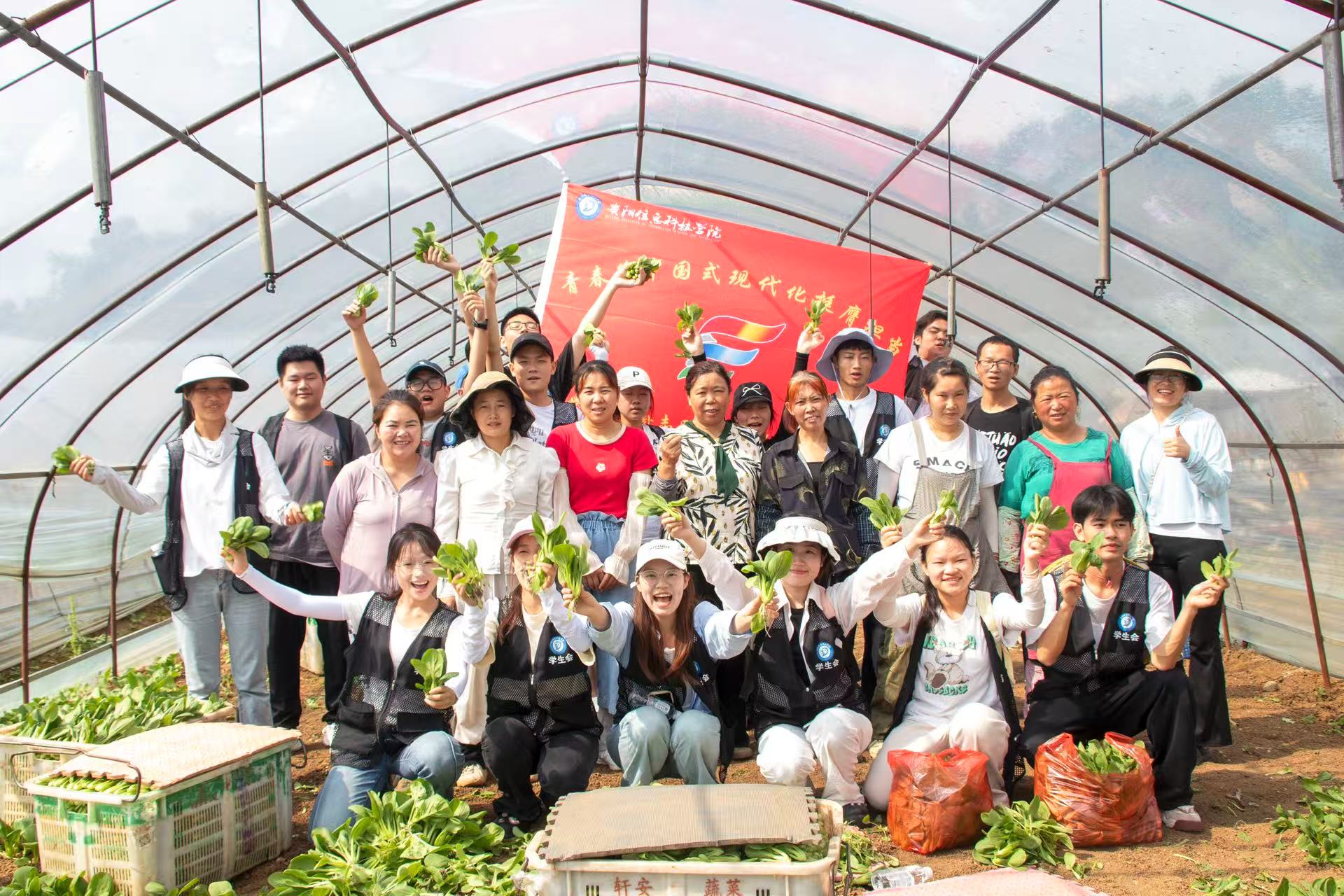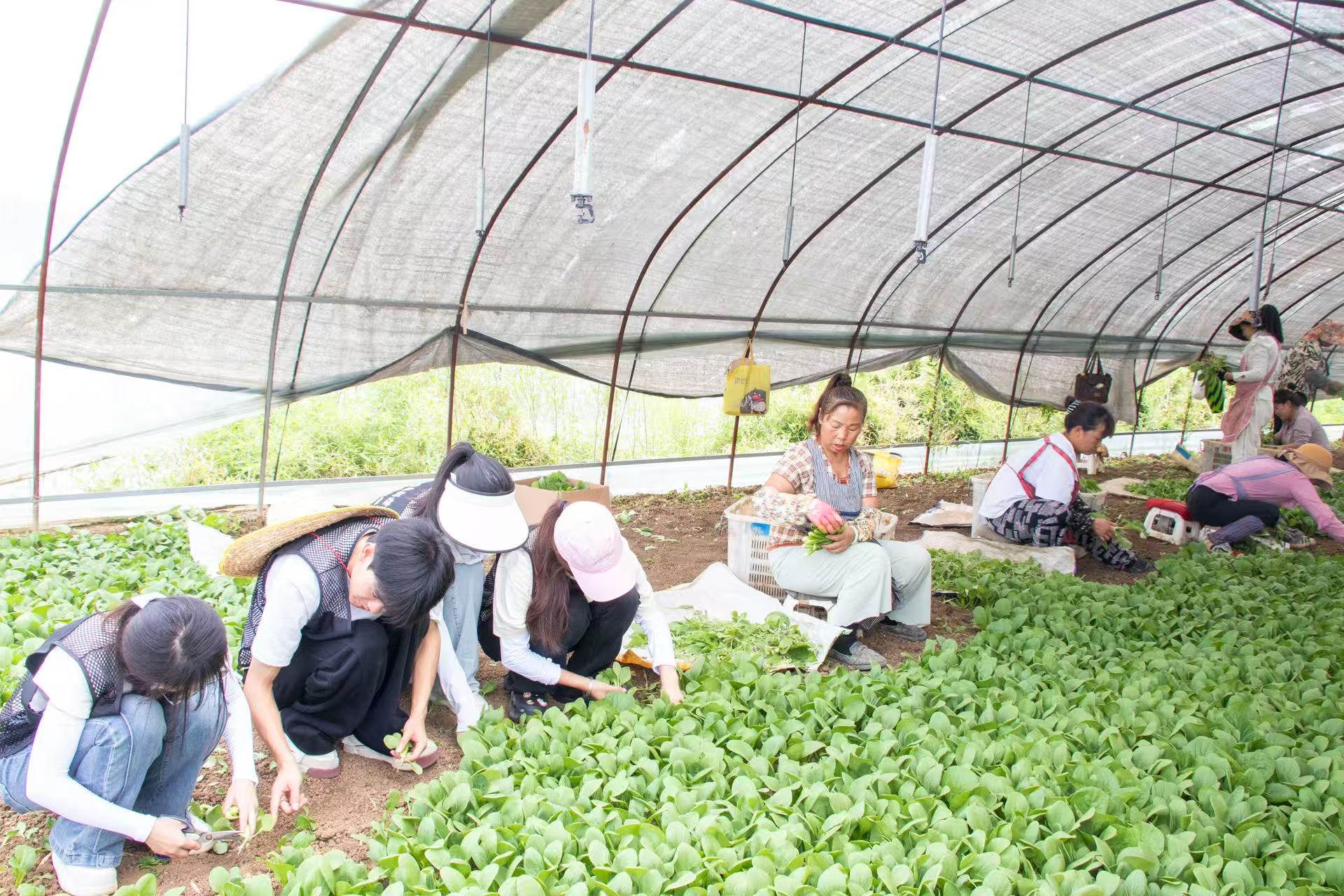 与此同时,实践队另一小队来到杉树村垚旺果蔬村民合作社蔬菜大棚基地。据基地负责人介绍,该基地总面积达600多亩,主要种植上海青,芹菜,茼蒿等蔬菜,年产量达1095吨,运往贵阳的各个角落,保障着城市的“菜篮子”供应。