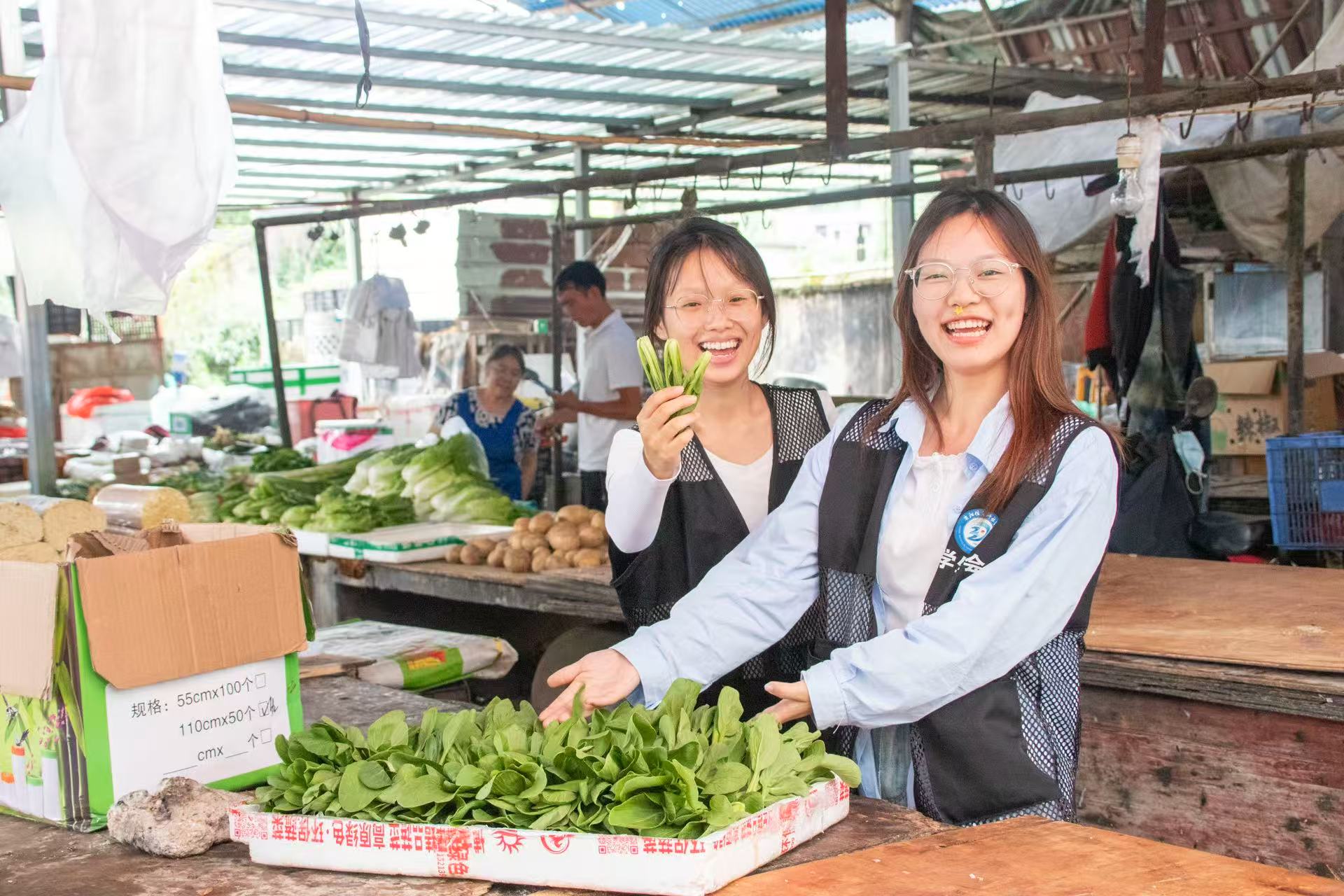 劳动结束后,大家挑出部分品相良好的上海青到集市试点售卖,还通过直播形式推介基地蔬菜,既为合作社带来收益,更点燃了青春助农的热情。