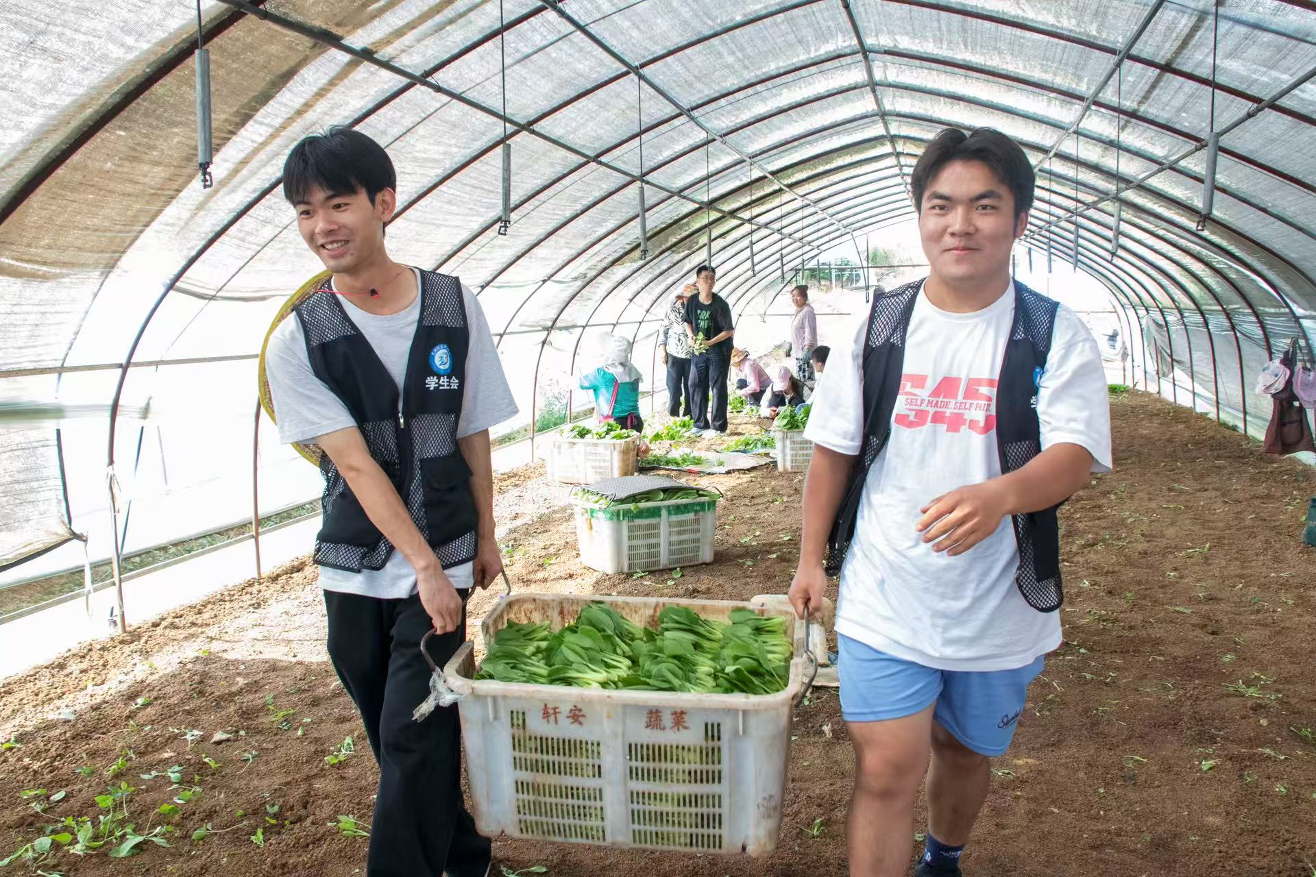 参观结束后,实践队队员们迅速投入到助农劳动中,帮助农民分工收割蔬菜上海青。大家分工协作,干劲十足,在汗水中切实体验了农事劳作的辛劳,也用实际行动为农户减轻了负担。
