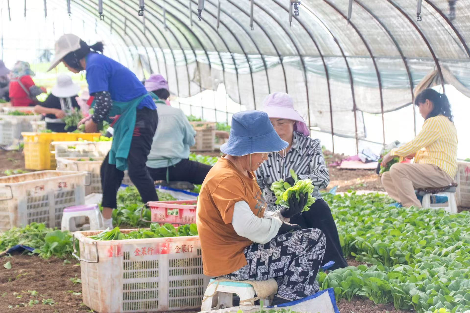 “基地蔬菜每天需要30到40名村民来采摘,大多是村里的中老年人,一天也能挣不少钱,让他们在家门口就能增收,补贴点家用。”负责人指着大棚里忙碌的身影说。