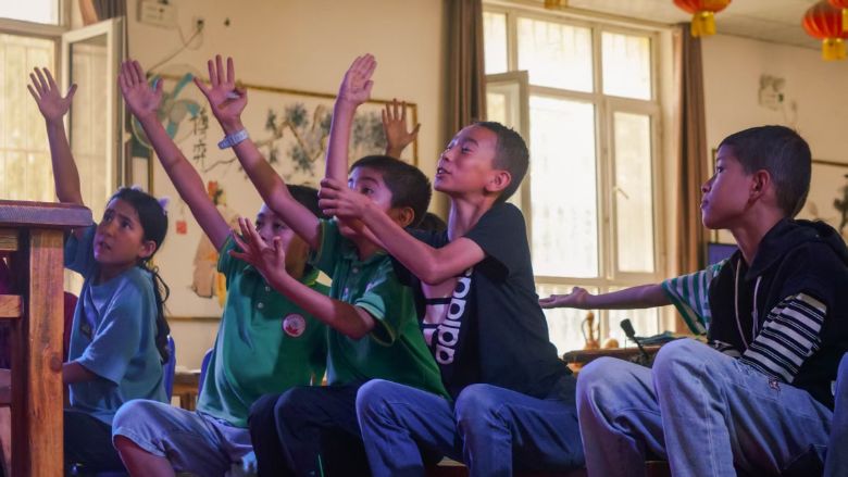 (图为阿克苏市友谊社区茶苑内青少年举手抢答)