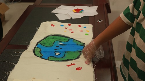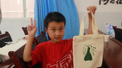 童心共护青山绿,数智绘就生态章。团队聚焦生态文明理念培育,以VR技术赋能环保教育,让环境“清”起来。孩子们通过垃圾分类模拟系统进入1:1还原的家庭生活空间,完成垃圾投放任务。错误操作会触发土壤污染动画演示,正确分类则展示资源化处理流程,强化环保意识。尘肺病防治模块让孩子“走进”矿山作业现场,观察粉尘扩散路径,并通过设备感知呼吸阻力变化,直观理解工业污染对健康和环境的双重危害。污水治理培训系统则以动态粒子模拟污水处理全过程,当水质达标时清澈水流的画面与欢呼声同步,正面反馈极大激发了孩子们主动参与环保的责任感。随后,“技能+N数智小学堂”通过帆布袋创作、环保手印等活动,让责任“行”起来。孩子们描绘出“戴口罩的地球”“垃圾分类小卫士”等图案,并按下靛青指印连成“绿色希望山脉”,高举作品宣言“保护生态,从我做起”,实现从科技认知到社会行动的价值转化。