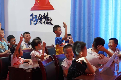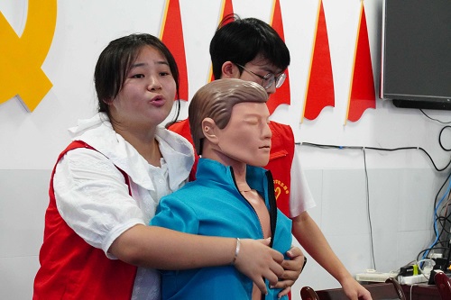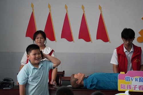 童心筑牢安全盾,数智点亮平安灯。团队聚焦青少年安全素养提升,以VR技术赋能安全(生命)教育,让场景“真”起来。孩子们通过沉浸式体验地震逃生、消防隐患排查等真实场景,掌握应急避险技能。“伏地、遮挡、手抓牢”的口诀在耳边回响,孩子们迅速找到三角区避险,亲历地震带来的紧张氛围。“这种学习方式像闯关游戏,我找到了所有隐患!”一名孩子兴奋地展示自己的“电子勋章”。随后,“技能+N数智小学堂”,通过心肺复苏实训、防溺水游戏、急救知识问答等形式,引导孩子们动手实践,在人体模型上练习标准按压动作;“冲脱泡盖送”烫伤处理口诀融入“吹球过河”游戏中,使安全知识从理论认知转化为行为本能。让本领“强”起来,让守护“实”起来,真正实现从“纸上谈兵”到“实战演练”的跨越。