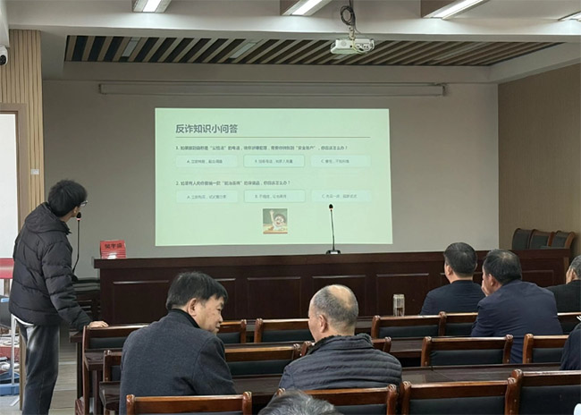 助老人认清诈骗套路、掌握防骗方法 讲座环节,队员结合老年人生活特点,从诈骗核心认知、常见类型与套路、真实案例警示、防骗技巧四个方面展开讲解,聚焦“养老理财”等高发诈骗手段,拆解骗局套路并强调“不轻信、不透露、不转账”的防范原则,同时播放反诈视频强化警示效果。