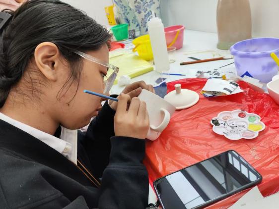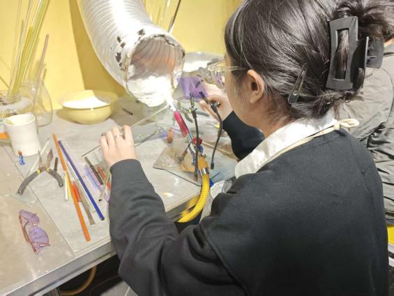 在景德镇,实践队员的双手第一次真正意义上触摸到文化的温度。拉坯机上,温润的陶泥在指尖的掌控下盘旋上升,形态渐显;玻璃工坊内,高温火焰将坚硬的玻璃料化为绕指柔,在专注的塑形中凝结成晶莹的艺术。这份“手过泥土,方知不易”的亲身经历,不仅让队员深刻体会到千年窑火背后一丝不苟的匠人精神,更成为她后续宣讲中最鲜活、最有力的第一手素材。