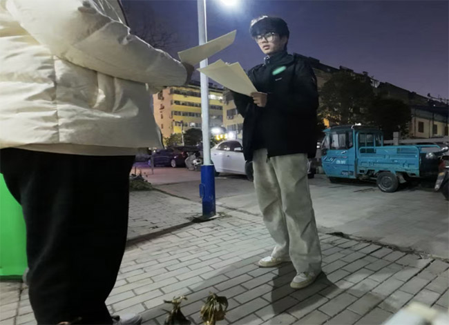 夜幕降临,团队成员相宇峰仍在社区广场向居民发放宣传资料。他不畏寒冷,耐心向过往居民讲解粮食安全知识,用实际行动践行着青年学子的社会责任。