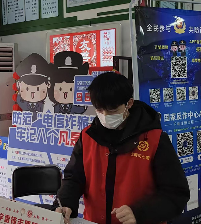 在社区服务中心,团队成员杨坤然身穿志愿者马甲,认真整理宣讲资料,为活动的顺利开展做好充分准备。他协助布置宣讲场地,准备宣传手册,确保每一项工作都井然有序。