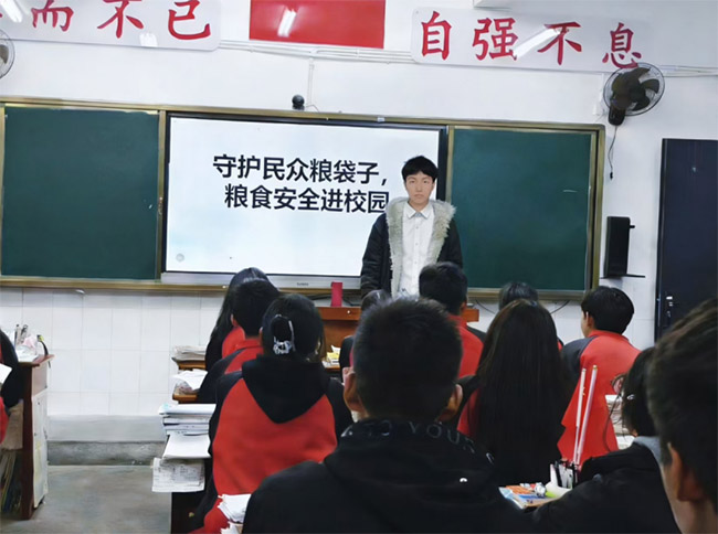 随后,杨坤然走进校园课堂,为学生们带来了一场生动的粮食安全主题宣讲。他以“守护民众粮袋子,粮食安全进校园”为主题,通过图文并茂的讲解,向同学们介绍了粮食安全的重要性,引导青少年从小树立珍惜粮食、节约粮食的意识。