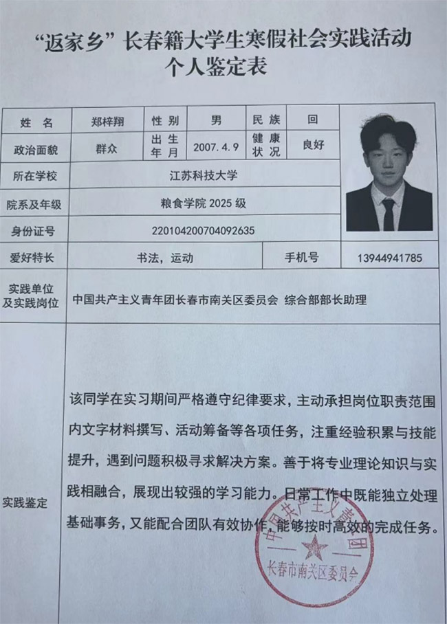 团队成员郑梓翔在实践活动中表现突出,获得了实践单位的高度认可。他在实践期间严格遵守纪律要求,主动承担岗位职责,善于将专业理论知识与实践相融合,展现出较强的学习能力和团队协作精神。