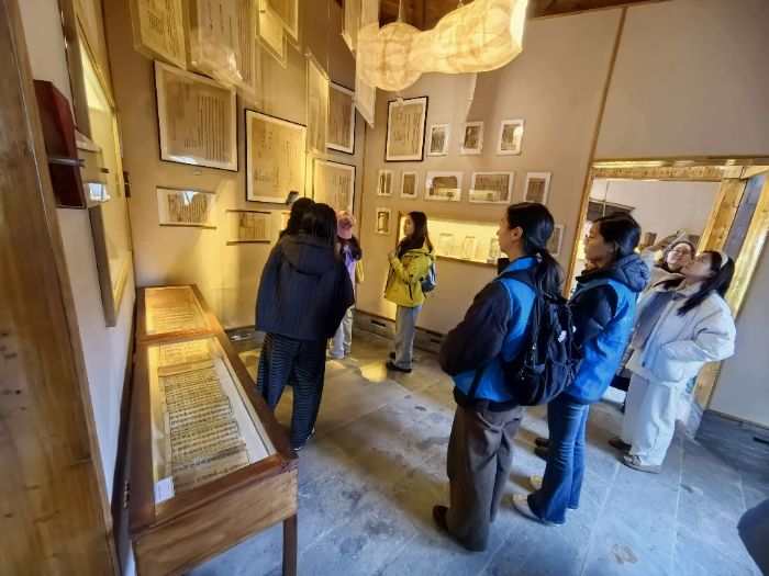 实践队首站来到高黎贡手工造纸博物馆。馆内陈列的各类手工纸及其制作工具,如一部立体的史书,承载着造纸技术的发展脉络。在工作人员深入浅出的讲解下,队员们系统了解了手工纸制作的九道工序:选料、泡料、煮料、打浆、抄纸、榨纸、背纸、晾纸、揭纸。