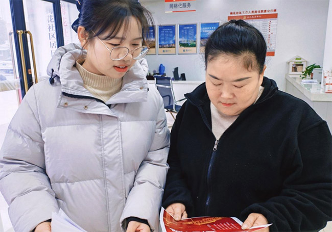 图为实践团成员在梅花社区向居民讲解民族日历上的内容。王晓冉 供图