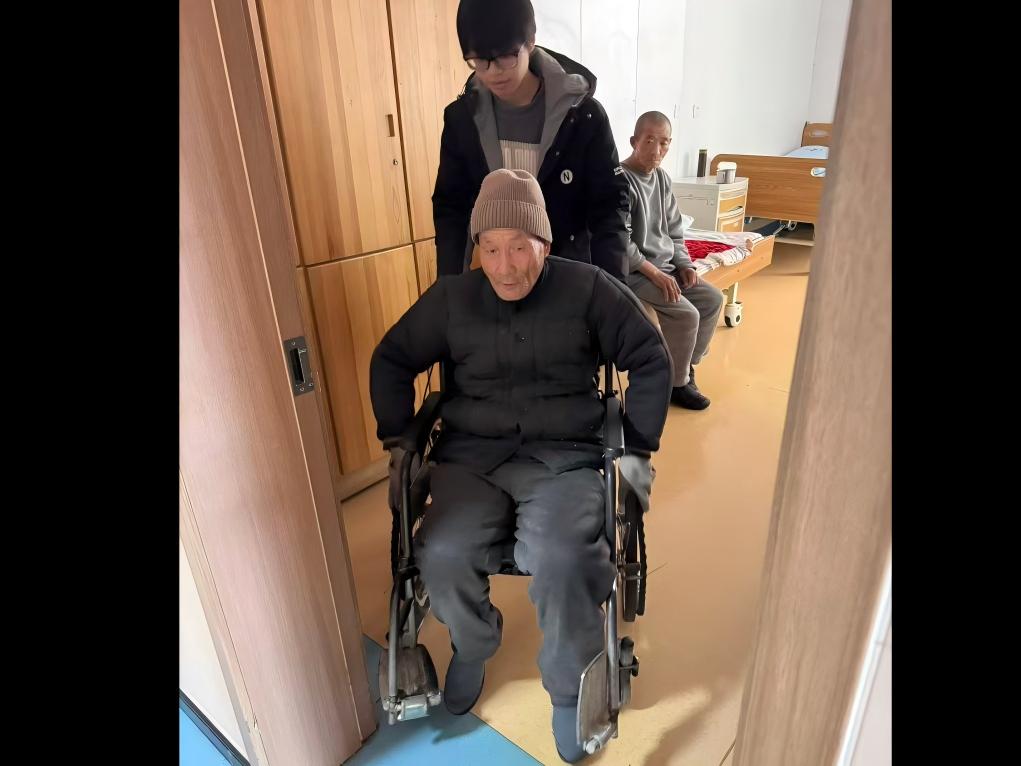 这是一位成员在辅助老人行动,带老人出去散散心晒晒太阳。