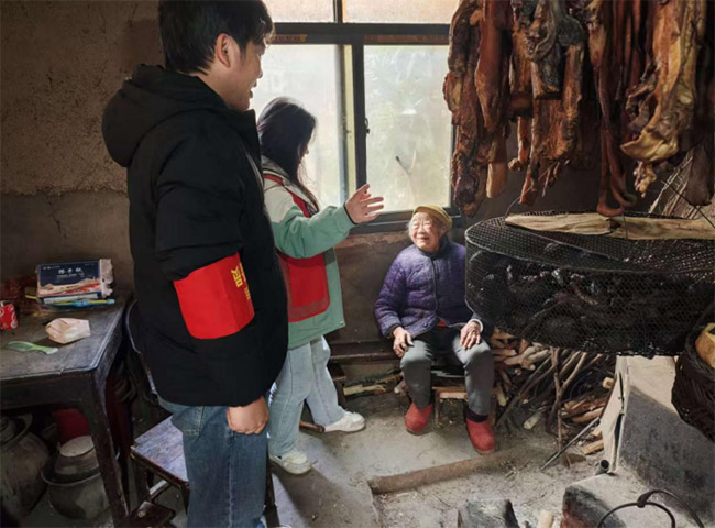 走访独居老人,是她此行的重要一环,陪他们拉家常,倾听岁月故事。面对冬日高发的安全隐患,村干部说道:“大娘,我们过来看看,腊肉熏着香是香,可得注意火,安全第一,您平安我们才放心。”该学生用之前学校所发的一些图片资料和最通俗的语言向老人们讲解防火知识,提醒熏制腊肉时远离易燃物、保持通风;她也热情讲解了电信诈骗的常见套路,教老人使用智能手机,看到他们学会视频通话与子女“见面”的笑容,那一刻,科技的温度,终于抵达了最需要它的人。