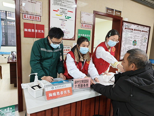 另外两名队员扎根急诊科分诊台,承担起预检分诊、病情初筛、就诊引导、咨询解答等任务。作为急诊救治的“第一道关口”,分诊工作节奏快、情况杂,队员们时刻保持专注,快速区分急症与轻症,合理分流患者,为重症患者优先开通绿色通道,全力保障急诊救治高效有序。