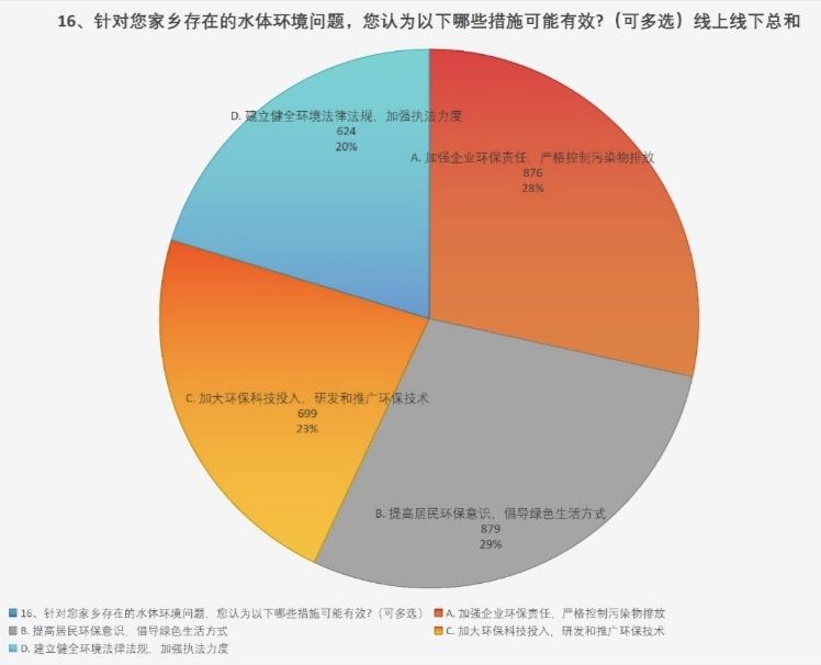 问卷分析结果显示,公众对家乡水体环境治理形成了清晰的共识。在“最有效措施”的多项选择中,“提高居民环保意识,倡导绿色生活方式”以29%的占比位列首位,“加强企业环保责任,严格控制污染物排放”以28%紧随其后。这既反映了公众对环保教育普及的期待,也表明了对污染源头管控的重视。同时,“加大环保科技投入,研发和推广环保技术”(23%)与“建立健全环境法律法规,加强执法力度”(20%)也获得广泛关注,体现了公众对综合治理、法治保障的深切期待。