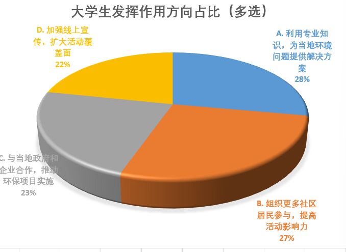 志愿者们深入家乡的河道、池塘等水体区域,结合问卷反映的重点关切区域,开展实地踏勘、影像记录和数据采集工作。通过将线上线下问卷数据与实地观察相结合,志愿者们不仅从量化和质性两个维度把握了环境问题的现状,也对其地域分布与具体表征形成了立体认识。活动反馈数据显示,28%的参与者认为活动最有价值之处在于“利用专业知识,为当地环境问题提供解决方案”,27%的参与者认为“组织更多社区居民参与,提高活动影响力”最为重要,另有23%的参与者认可“与当地政府和企业合作,推动环保项目实施”,22%的参与者认为应“加强线上宣传,扩大活动覆盖面”,展现了专业调研与公众参与的有机结合。