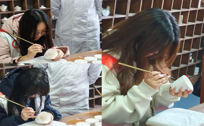 随后,团队来到大球泥瓷艺厂,走近非遗传承人邓鸿昌工作坊,近距离体验釉下五彩瓷的制作工艺,传承人现场展示手工拉坯、釉下彩绘制绝活,亲手指导志愿团成员体验彩绘技法,握起毛笔的那一刻,才深知彩绘之难。面对传统工艺现代化发展的疑问,传承人耐心解答,传承人“守艺不是守旧”的话令人豁然开朗,非遗传承并非照搬老技法,而是要在传统中寻新意,让老手艺真正走进年轻人生活。