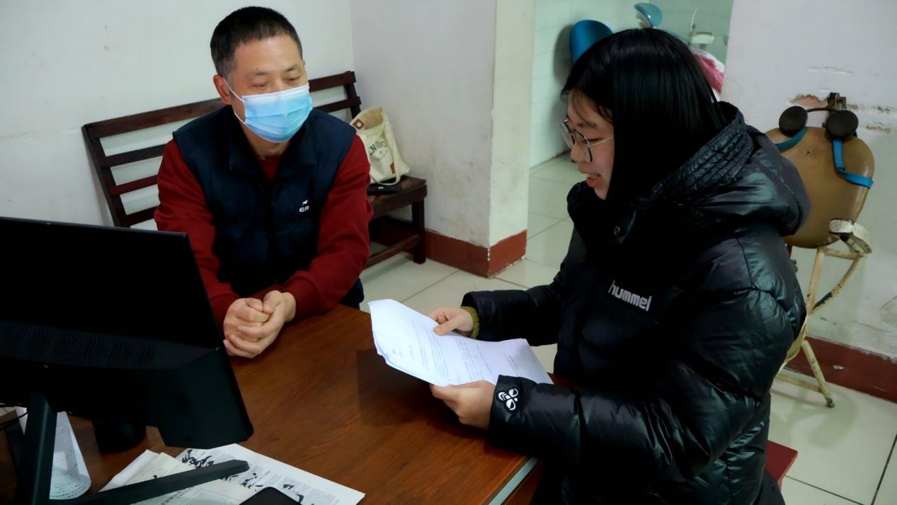 (图为实践队队员张芸艺对县人社局养老保险中心主任进行访谈)