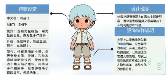 团队以设计激活文化基因,为茶前山村的海盐产品设计logo和IP形象,并以此设计出一系列文创产品,如海盐包装,茶杯等。