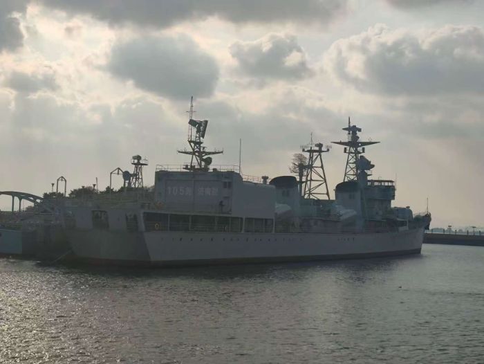 离开室内展馆,队员们来到海上展区。三座码头旁,济南舰、鹰潭舰、鞍山舰、长征一号核潜艇等十余艘退役功勋舰艇静卧海面,舰身虽布满锈迹与弹痕,却依旧透着凛然威严,如同沉默的卫士守护着黄海之滨。