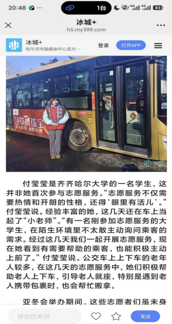 二、城市侧保障:公交双语传递冰城温度 2025年2月亚冬会期间,在学校党团委持续指导下,团队以付莹莹同学为负责人,李嘉玉同学、谢春洋同学、吴鸿博同学加入亚冬会公交双语志愿服务队伍。我们在市区公交车上为国内外游客提供双语引导、秩序维护、应急翻译等服务。党团员志愿者主动帮扶乘客、解决突发问题,事迹被哈尔滨官方媒体“冰城+”报道,展现了新时代青年“服务社会治理”的担当。