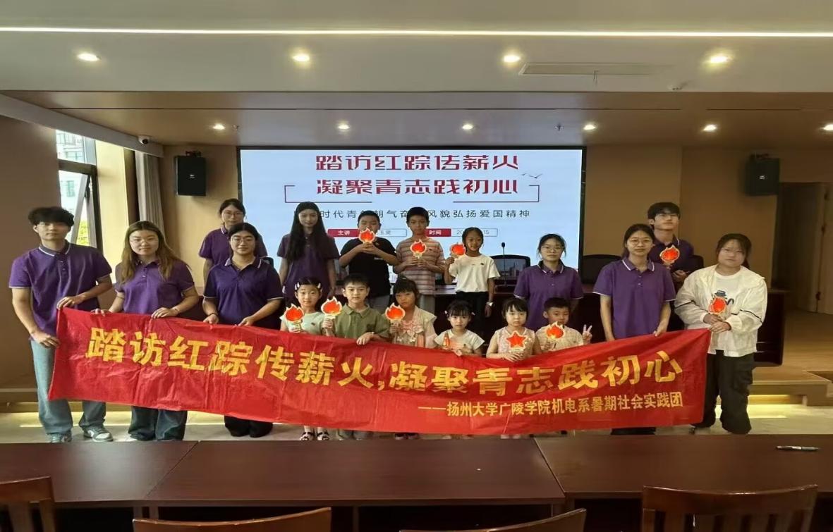 (图为扬州大学广陵学院“踏访红踪传薪火,凝聚青志践初心”实践团队与小朋友们合影。姜心语供图。)