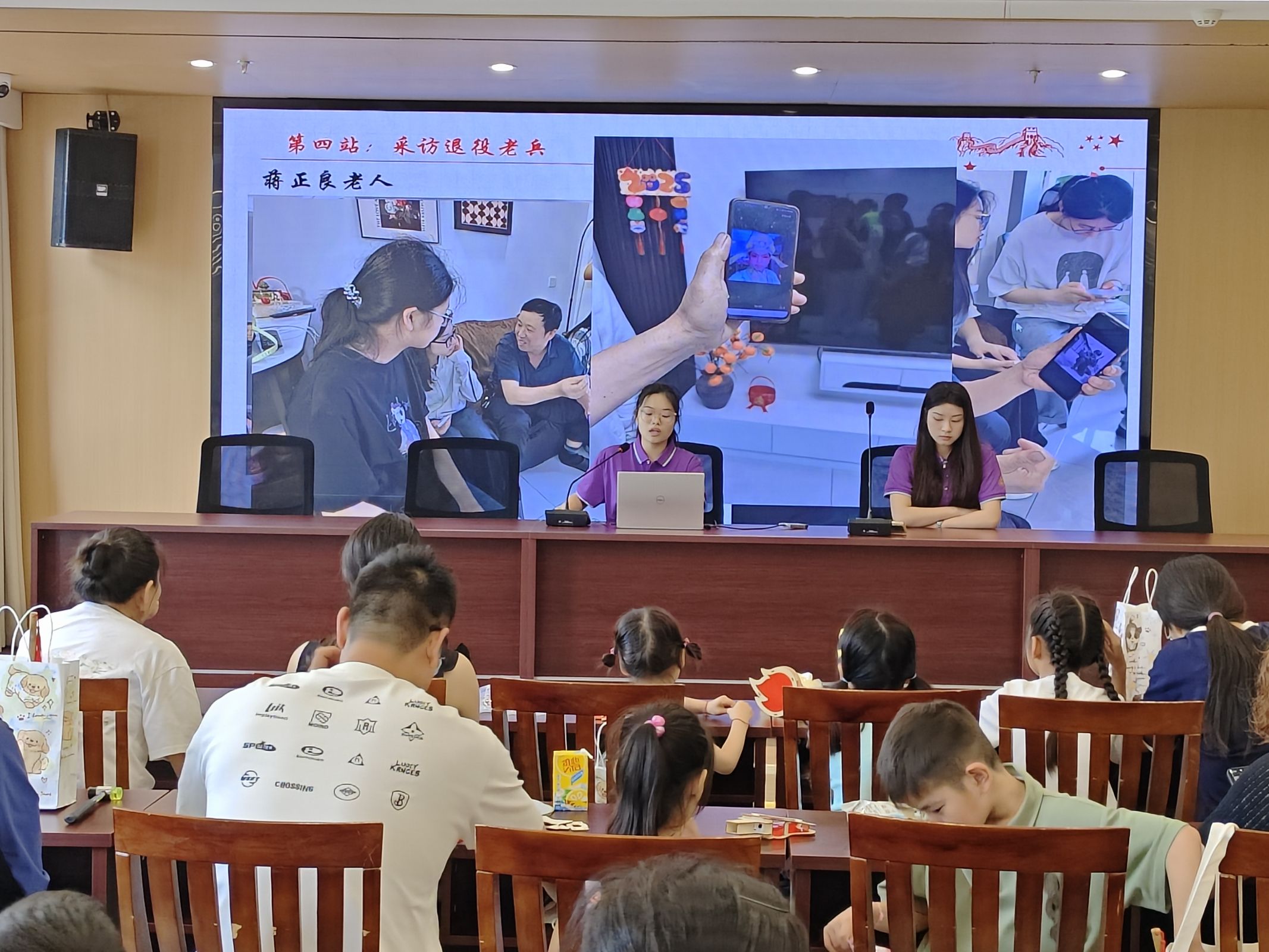手工制作环节结束后,实践团队成员纪玉灵为小朋友们讲述了一段充满意义的红色之旅。他们详细介绍了此次暑期实践中,团队先后探访许晓轩故居、扬州烈士陵园以及蒋庄村退役老兵的经历。在许晓轩故居,团队成员仿佛穿越时空,看到了许晓轩烈士在艰苦的环境中坚守信仰、英勇斗争的身影。“许晓轩烈士在狱中,尽管遭受了敌人的残酷折磨,但他始终没有放弃对党的忠诚和对革命胜利的信念。”团队成员动情地讲述着,“他在临刑前,还高举双手向战友们道别,嘱咐大家要继续为革命事业奋斗。”小朋友们听得入神,眼中满是敬佩。来到扬州烈士陵园,团队成员在庄严肃穆的氛围中,缅怀那些为了国家和人民英勇牺牲的烈士们。“每一座墓碑都代表着一位英雄,他们用自己的生命换来了我们今天的幸福生活。”而在蒋庄村,团队成员拜访了退役老兵。“那时候,我们不怕困难,不怕牺牲,只为了保卫我们的国家。”老兵的话语铿锵有力,让小朋友们深刻感受到了前辈们的英勇无畏和爱国情怀。