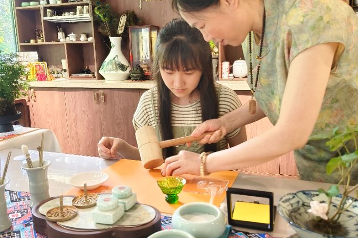 实践团成员陈孜妍学习老师的制香示范 王滢摄