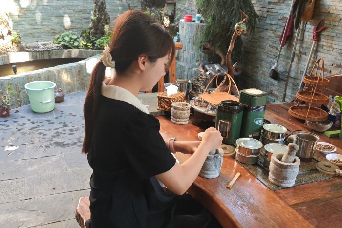 实践团成员李冰鑫用石臼碾磨香草 陈孜妍摄