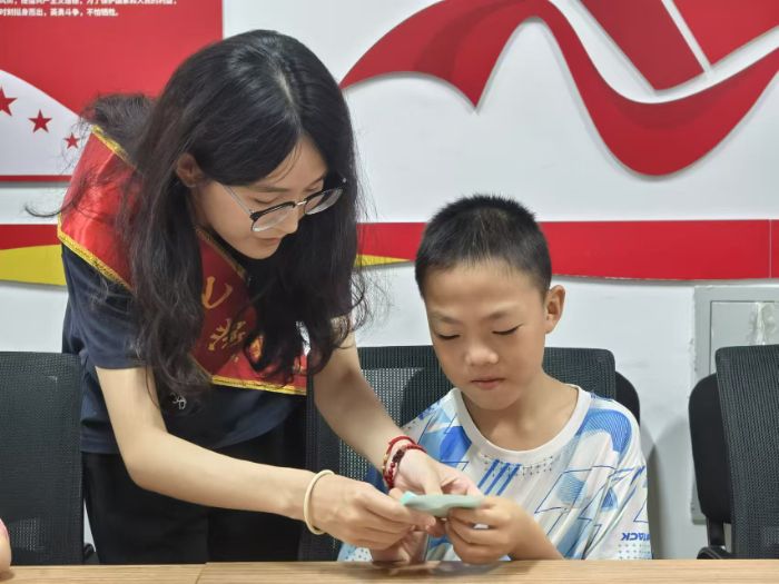 (图为我志愿者指导小朋友们折小军帽,张喜语通讯员摄)