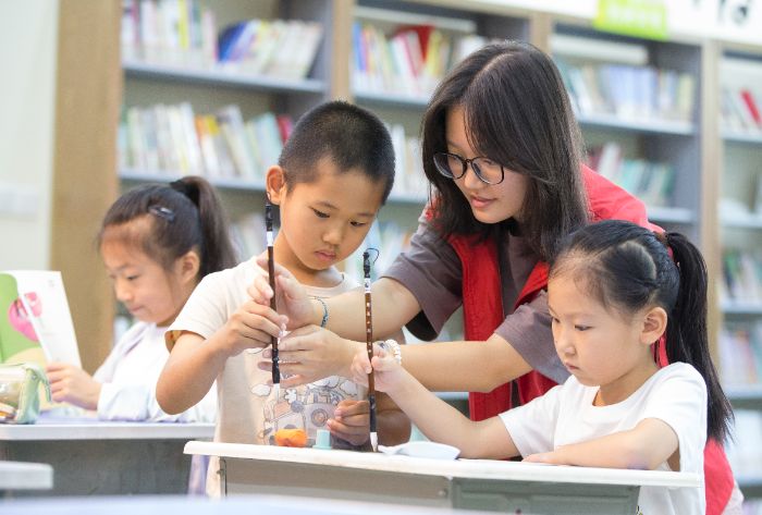 (图为志愿者教小朋友们学写软笔字。黄艳供图)
