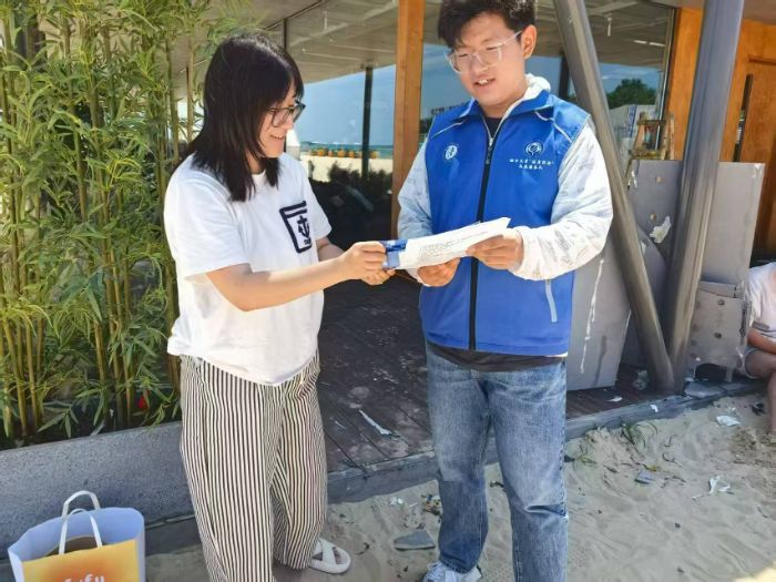 (图为实践队队员在海边向游客介绍AI诈骗类型 “法盾防诈”实践队 王一诺 供图)