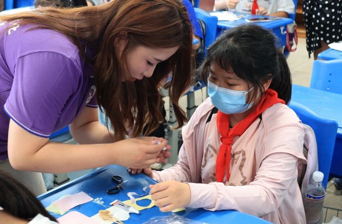 (图为团队成员辅导同学们做手工。孙涵摄)