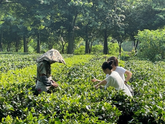 青领振兴实践队踏上乡村振兴征程,走进连片的生态茶园。他们通过实地走访、座谈交流、问卷调研等多种方式,全方位了解茶乡的发展状况。在茶园里,队员们跟随茶农学习采茶,“一针两叶”是夏茶采摘的标准,“提而不掐”是采摘的关键技巧。大家小心翼翼将茶叶摘下,在亲身体验中,真切体会到茶农劳作的辛勤,也感受到传统采茶技艺的精妙之处。指尖与鲜叶的接触,让队员们与英德红茶的生长之源有了更紧密的连接。