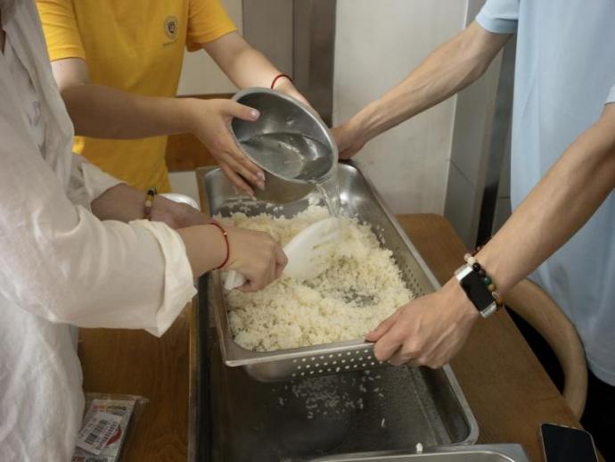 7月6日下午,微尘小队于行云食堂“稻花香里酿新篇”。依循发酵原理,队员示范选米、浸蒸、冷却、拌曲、发酵全过程,严控拌曲温度防灭活。酒曲米饭入盒压实,中孔助发酵。夕阳西下,首批酿制的米酒散发出淡淡的醇香,这场融合传统智慧与科学创新的实践活动,不仅让古老的米酒酿造技艺在校园焕发新生,更将健康生活的理念播撒于师生心田。