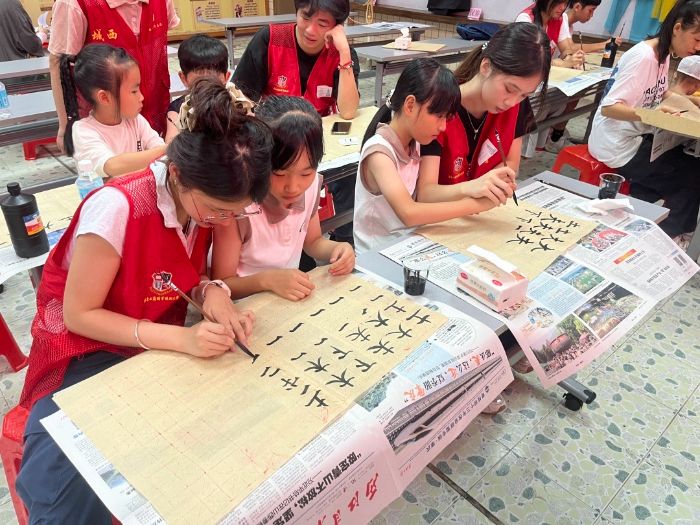 一、突击队赋能民族团结,让非遗走进居民日常,促文化共融 依托正西社区民族团结进步品牌,队员们巧妙地以玻璃画、书法、象棋以及竹扇编织为桥梁,将这些充满魅力的非遗文化带进了社区日常。他们手把手地教各族孩子们提笔写字、布局下棋、编织竹扇,让孩子们在亲身体验中感受玻璃画的灵动、书法的气韵、象棋的智慧以及竹扇编织的非遗温度。