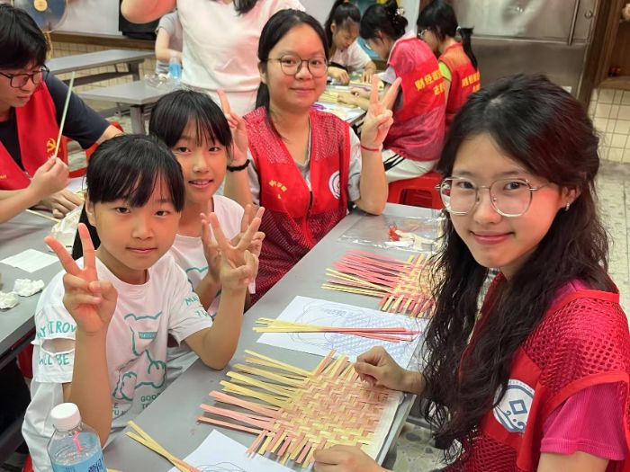 图为突击队队员带领社区小朋友学习非遗竹编