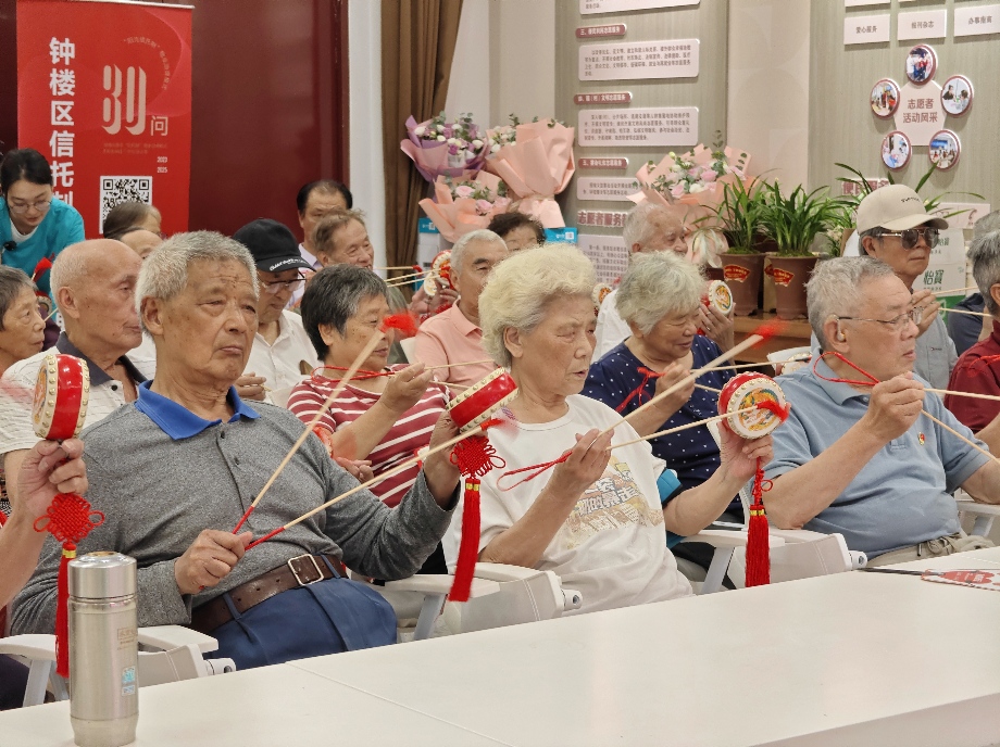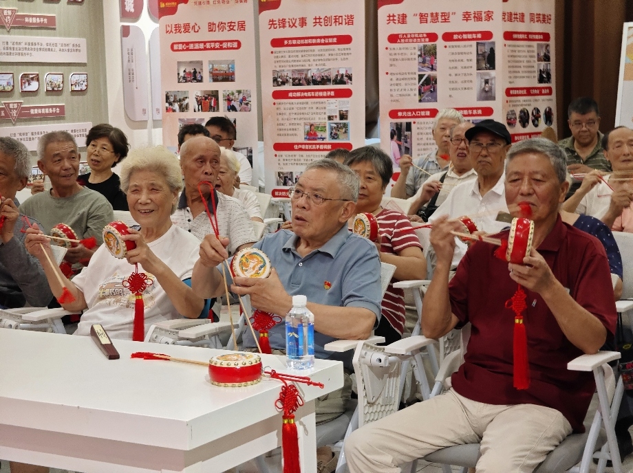 为了让红色文化体验更加立体多元,实践团巧妙地将小岗村的国家级非物质文化遗产——凤阳花鼓融入活动现场。在实践团成员的耐心引领下,老年党员们纷纷参与到花鼓技艺的学习中来,从起初的生涩模仿,到逐渐有模有样地打出节奏,现场欢声笑语与鼓点交织。随着全场共同演奏,在悠扬的花鼓声中,“小岗精神”的创新活力与奋斗精神悄然浸润心田。