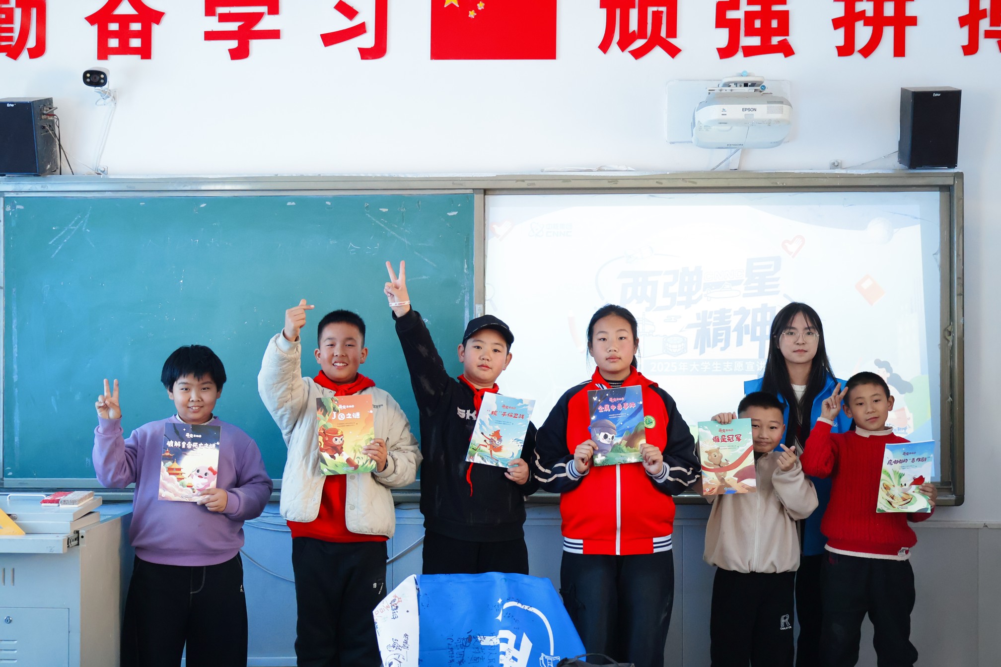 面向小学生群体,构建“宣讲+科普”启蒙乐园。 在榆中县高墩营小学、夏官营镇小学的课堂上,抽象的“两弹一星”精神化为了生动的故事与斑斓的色彩。宣讲团精心设计《童心绘功勋,星火代代传》、《星火相传,核你一起》等课程,通过动画短片、科学家故事、趣味问答和“我心目中的功勋科学家”海报创作等环节,让科学的种子在欢声笑语中生根发芽。孩子们笔下蘑菇云下的欢呼、灯光下的算盘,正是“自力更生”、“大力协同”精神最纯真而深刻的诠释。