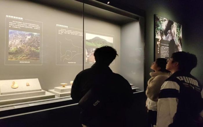 上午9时,团队准时抵达博物馆。在讲解员的引导下,成员们重点参观了“吉金万里”特展中的三星堆专题展区。成员们从青铜神树残件的图腾符号中解读古蜀先民的宇宙观,从黄金面具残片的工艺细节中感受古蜀文明的精湛技艺,并对比三星堆与广西左江岩画、贺州史前遗址出土的文物,分析岭南与巴蜀地区的早期文化交流痕迹。之后,成员们参观了“广西古代文明陈列”展厅,从甑皮岩遗址的史前陶器,到壮族铜鼓的纹饰演变,再到近代广西的革命历史文物,系统梳理广西少数民族文化的形成与地方发展脉络。同时,成员们还对壮锦、绣球等非遗展品进行了详细记录,了解其文化寓意与当代传承现状。