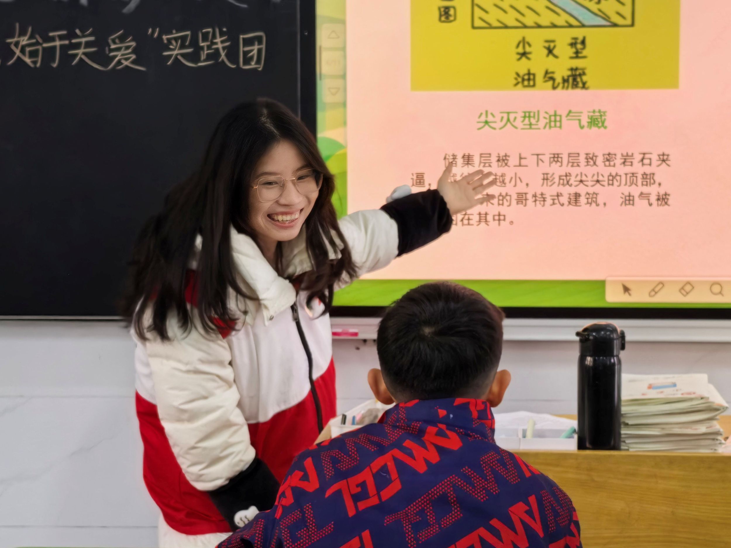 图为志愿者向孩子们介绍石油和天然气的“家”时与孩子进行互动。杨百慧 供图