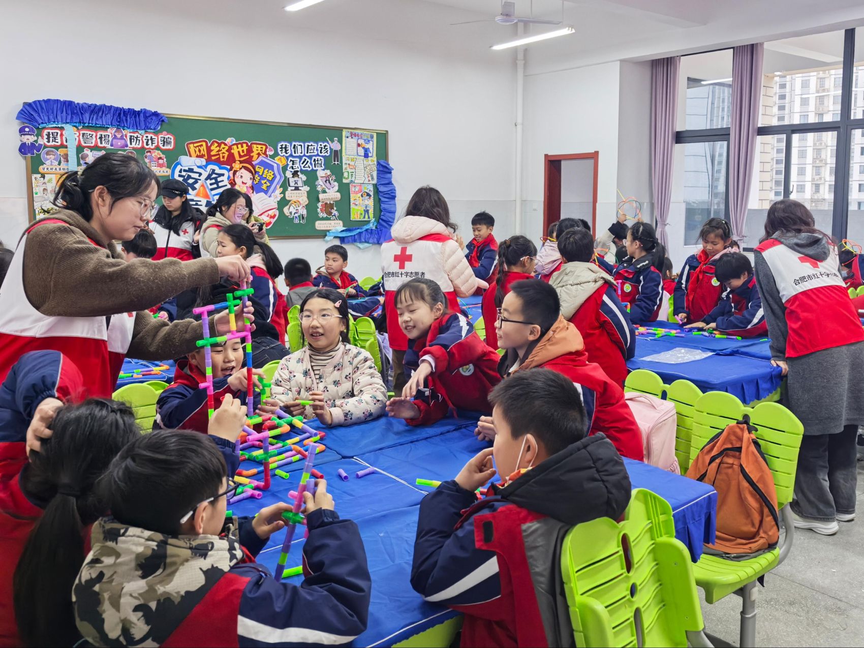 图为孩子们向志愿者介绍自己用吸管搭建的作品。王灵娜 供图