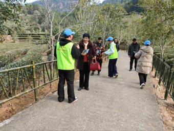 图1 团队成员向游客派发宣传手册结束燕子窠讲解后,团队转场至燕子窠“三茶”统筹馆,这里作为展示武夷“三茶”融合成果的核心场馆,让我们得以系统学习习近平总书记“三茶”统筹理念的实践脉络和丰富的茶历史、茶文化。