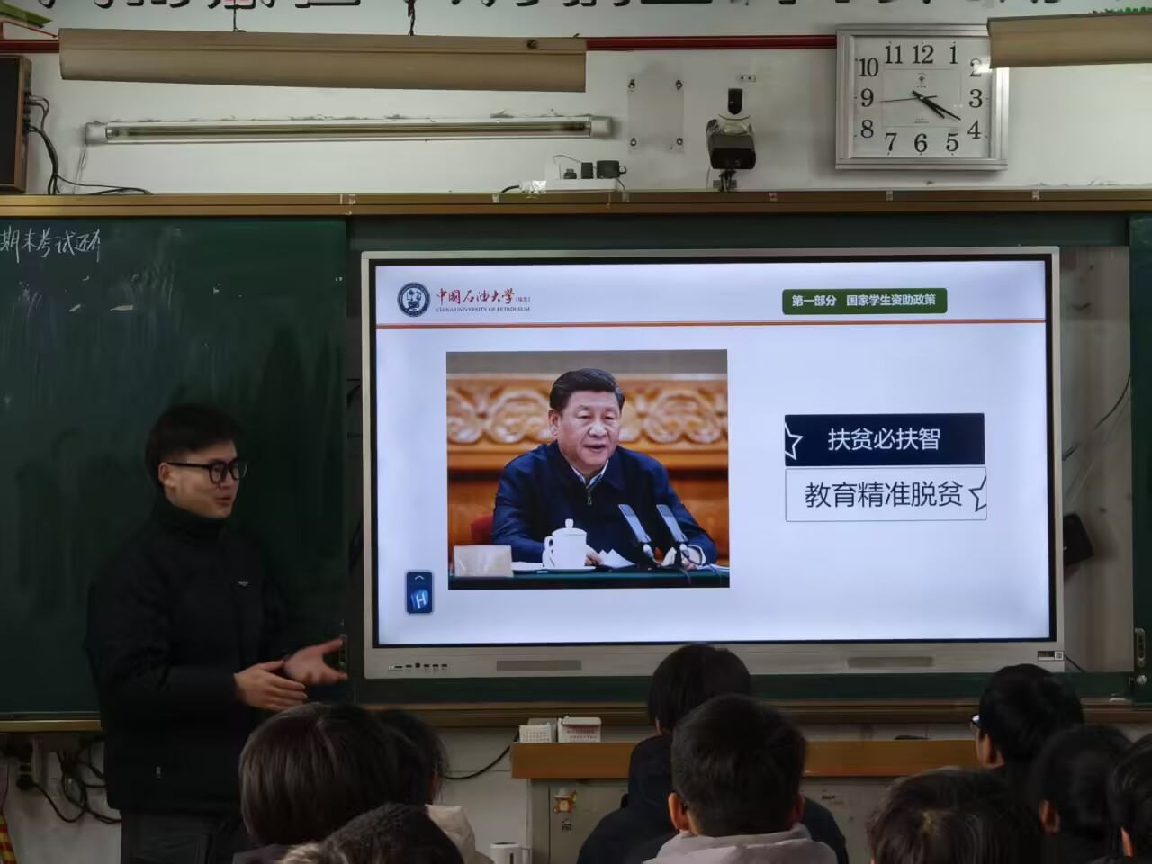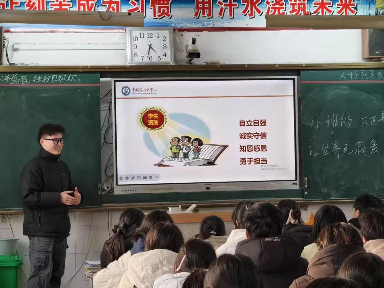 2026年1月26日,中国石油大学(华东)石油工程学院学生刘俊辉返回母校河南省洛阳市新安县第一高级中学,面向高二年级两个班级的百余名学生开展了国家学生资助政策宣讲活动。